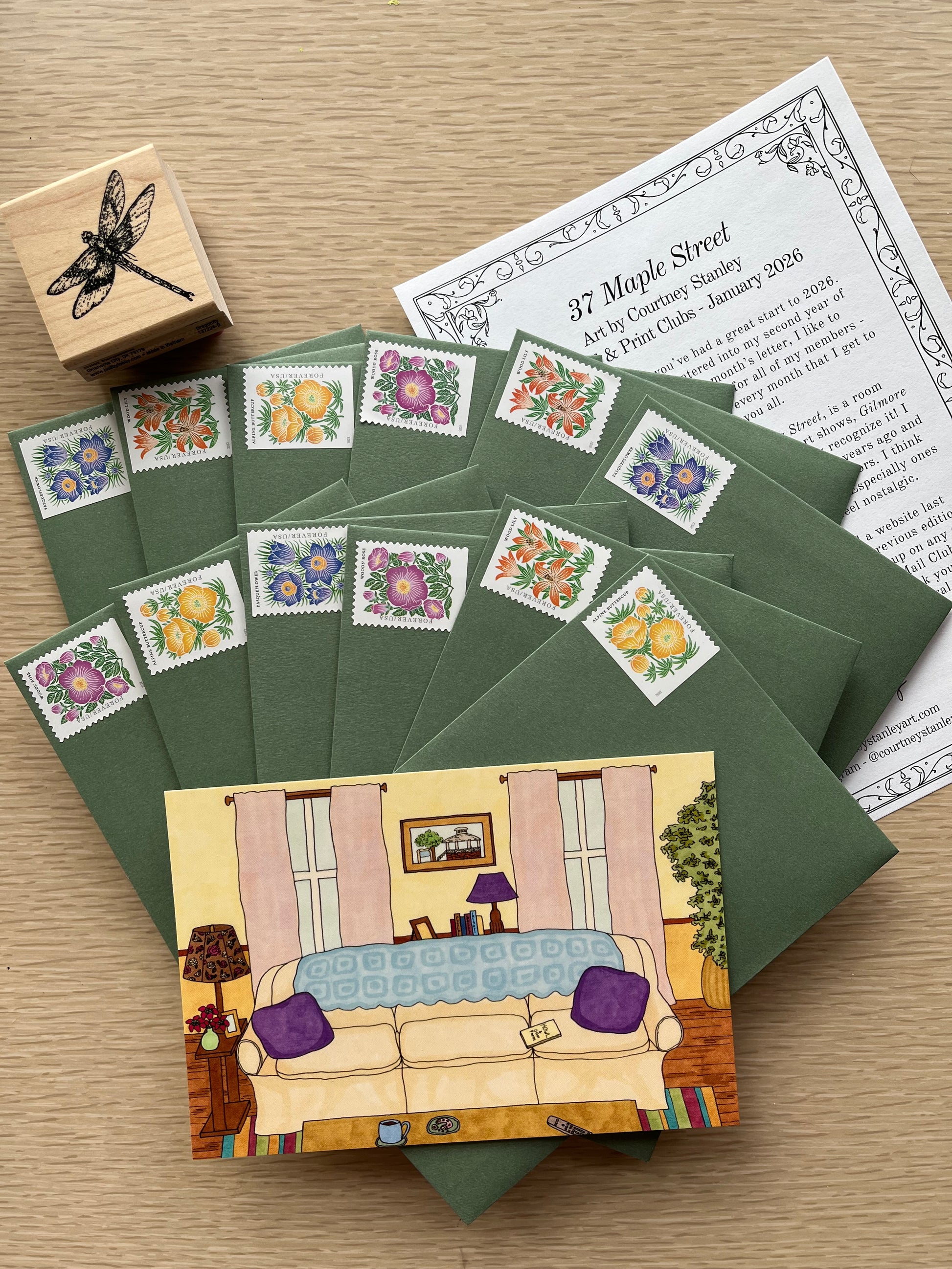 My snail mail club is for anyone who appreciates cozy and vibrant art, wants to affordably expand their art collection, receive some happy mail every month, or all of the above!